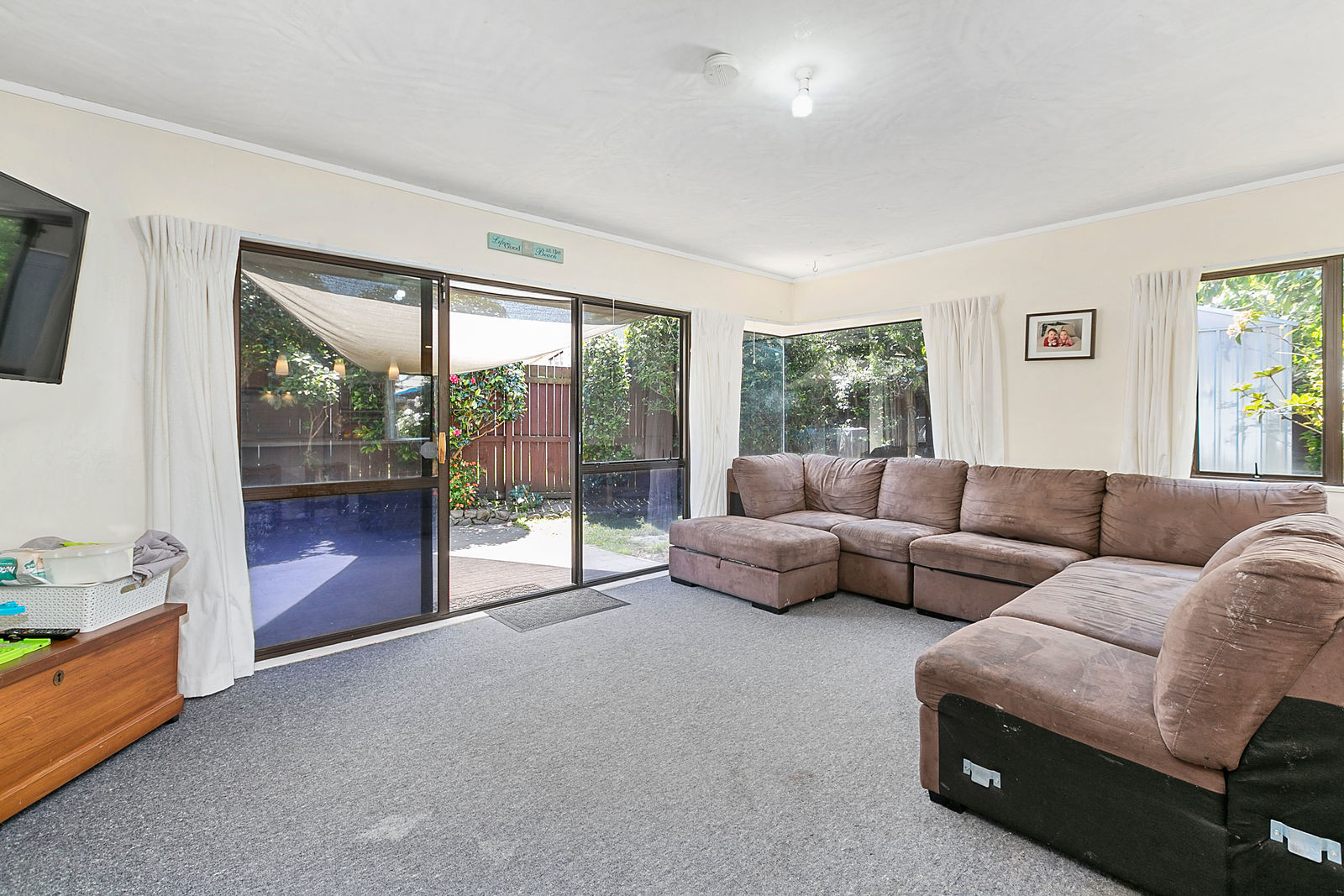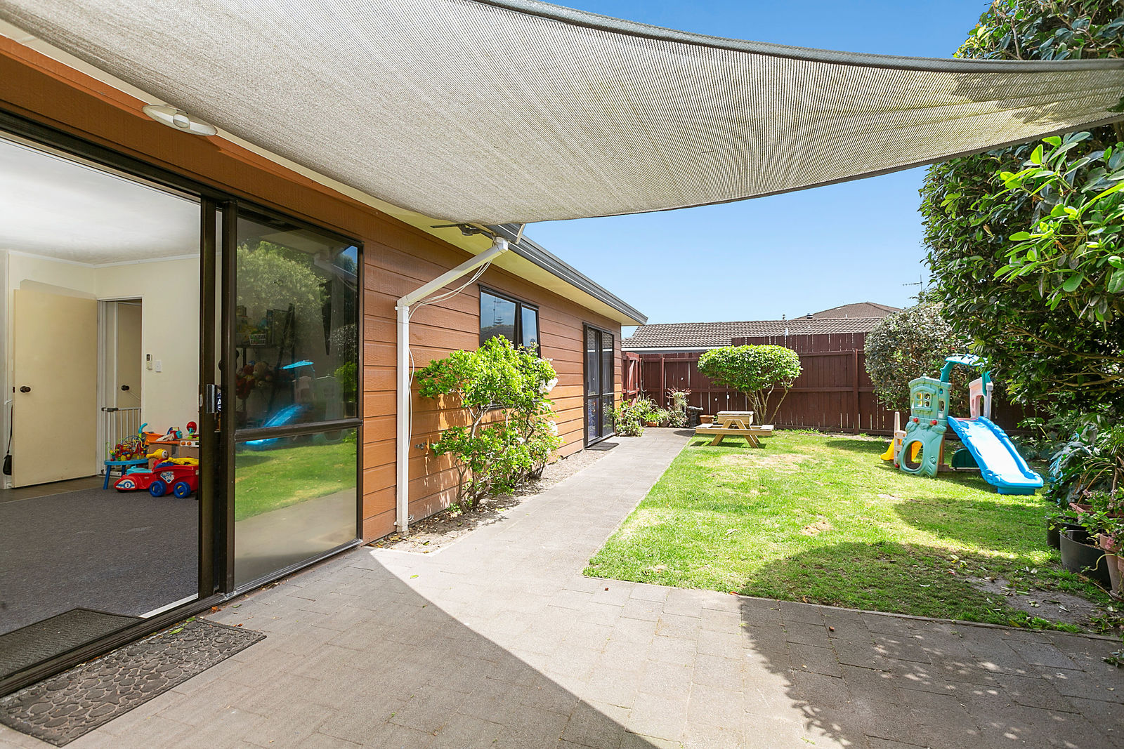 Our sunny, private family home has 3 double bedrooms and large open plan living, dining and kitchen space with sliding door access to the patio area. The outdoor area has a shade sail creating wonderful additional room for the family to relax and enjoy outside.