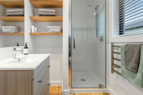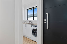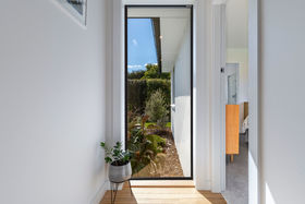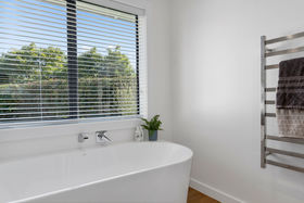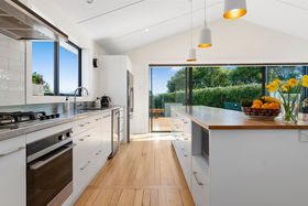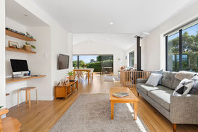 A beautifully crafted upgrade and extension has created a bright three-bedroom, two-bathroom cocoon with tawa floors, excellent insulation; the raked ceiling in the L-shaped open plan living and 32sq m of deck enhancing its lightness of being. In this impressive expression of compact home with large heart the master suite's bathroom is deliciously spacious and blue gum gleams softly as kitchen island and laundry benchtop.