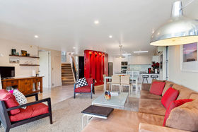 At entry level, the warmth of the underfloor heated tiled floors greets you and your eyes are immediately drawn to the vista beyond the structural artistry of the curved red wall. Natural instinct leads you through the rear wall of glass out onto the un-bordered garden complete with tropical planting, mature palms and hidden gas fire pit.