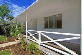 A traditional covered veranda at the front door entrance with a growing wisteria, sets the tone that will add appeal to this cottage style garden. With potential to add some old roses, lavenders and a picket fenced to complete the look.