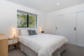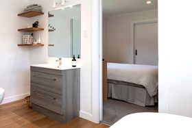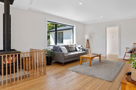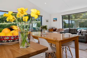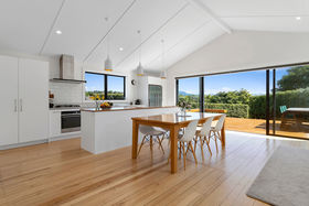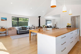 A beautifully crafted upgrade and extension has created a bright three-bedroom, two-bathroom cocoon with tawa floors, excellent insulation; the raked ceiling in the L-shaped open plan living and 32sq m of deck enhancing its lightness of being. In this impressive expression of compact home with large heart the master suite's bathroom is deliciously spacious and blue gum gleams softly as kitchen island and laundry benchtop.