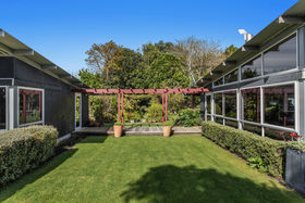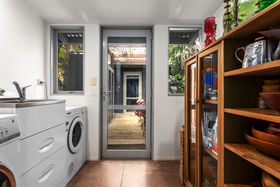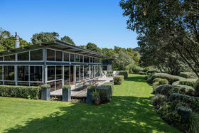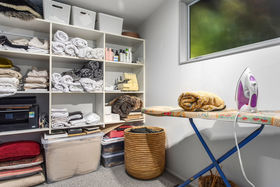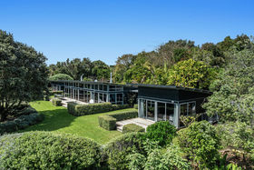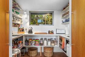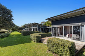Inside, the home is light-filled and welcoming. The home is all on one level, with open-plan living, dining, and galley kitchen and large windows along the north-facing side bringing the outdoors in. Practical features include a generous pantry, laundry, and linen room, all equal in size for easy use. There's also a separate library space with garden and beach views.