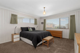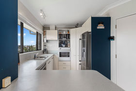 The café-style kitchen and open-plan dining feature expansive windows framing a spectacular outlook toward Welcome Bay and the surrounding hills, bringing light, space, and a sense of calm to everyday living. Spacious living opens to a covered balcony for dining or relaxing alfresco, while a gently modernised bathroom and separate toilet service two large bedrooms of which the master also opens to the balcony and those views.