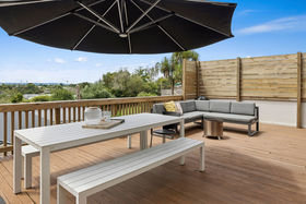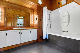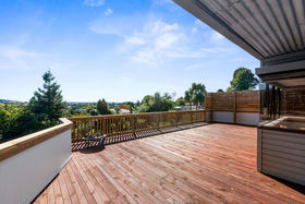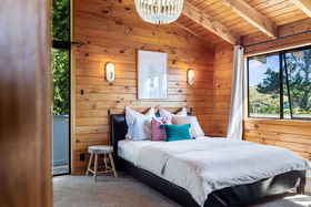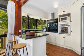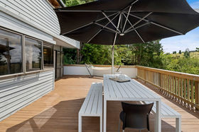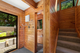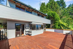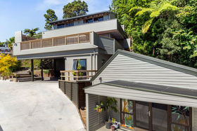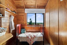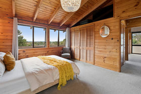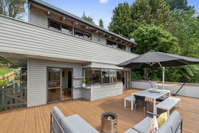 The home enjoys excellent sun and strong indoor-outdoor flow on every level. The middle level forms the heart of the home, featuring open-plan living, dining and a neat and practical kitchen, all extending to a large wrap-around deck with elevated views. A powder room and laundry are also located on this level. The upper floor houses two bedrooms plus an office and a family bathroom, with rustic sarked timber ceilings creating warmth and character. Two bedrooms open onto another wrap-around balcony, enhancing the home's strong connection to the outdoors.